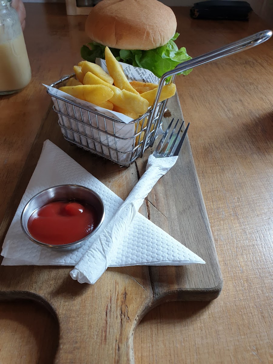 Coffee was hot. We had lunch there too. Burger and fries. Good size burger, needed to be eaten using knife and fork! Fries were crunchy and hot.